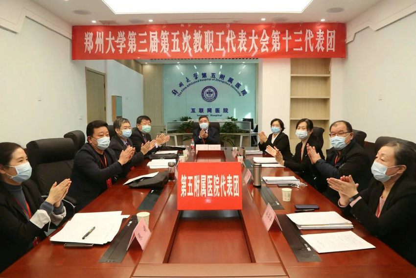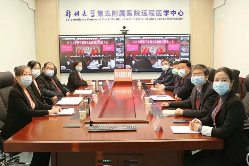 2022年2月26日,郑州大学以线上线下相结合的方式召开第三届第五次教职工代表大会。郑州大学五附院院长郑鹏远,党委副书记、工会主席徐翠英,副院长朱光等9名代表组成第十三代表团在门诊五楼远程医学中心参加会议。