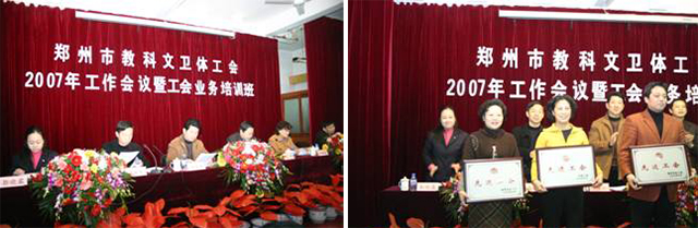 3月22-23日,郑州市教科文卫体工会2007年工作会议暨工会业务培训班由我院承办。教科文卫体工会所辖的一百三十余家单位参加了此次会议。会议回顾了2006年的工作,部署了2007年工作重点,对教科文卫体系统2006年的先进基层工会和优秀工会工作者予以了表彰。与此同时,郑州市教科文卫体工会“六有”规范化建设现场会在我院召开,与会者参观了我院工会台帐、制度,职工活动中心及室外活动场地,对我院的工会工作给予了高度评价。这次会议使医院加强了与上级工会的联系,密切了与同级工会的横向交流,宣传了医院,扩大了医院的知名度。