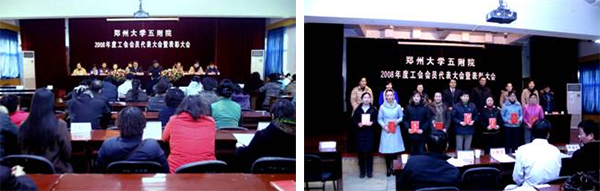 大会由院工会副主席刘宝玉同志主持。首先,院工会主席陈琳同志向大会作了题为《实践科学发展观 发挥工会特有作用 团结广大职工为医院又好又快发展而努力奋斗》的2008年度工会工作报告。随后院工会委员会委员吴敏同志宣读了《郑州大学第五附属医院工会关于表彰2008年各类先进的通知》,院工会被评为郑州大学先进工会、荣获了河南省总工会授予的“职工书屋示范建设单位”、河南省教科文卫体工会授予的“职工之家建设示范单位”荣誉称号。外五工支会被河南省教科文卫体工会授予“模范职工小家”的荣誉称号。总结表彰了3个院先进工支会、13个院先进职工小家、7个院先进文体协会、97名院工会工作积极分子。