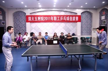 9月7日至13日,我院职工乒乓球选拔赛在职工活动中心拉开帷幕。本次比赛是为了备战学校教工乒乓球团体赛所开展的院内选拔赛。共有来自10个工支会的24名男职工和20名女职工报名参加了比赛,院长王建平、党委书记李新华和副院长乔保忠也分别代表各自的工支会参加此次比赛。比赛采取五打三胜制,通过抽签分组,确定对阵选手,经过三个下午的激烈角逐,选拔出了4名男选手和3名女选手。本次比赛不仅为爱好乒乓球的职工们提供了一个相互交流、切磋球技的机会,同时也促进了大家积极健身的热情,为丰富我院职工业余文化生活注入了新的活力。