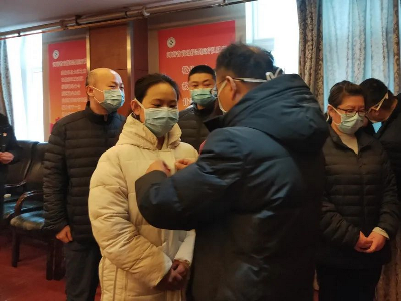 郑州大学五附院援鄂医疗队队员、入党积极分子付群、胡绍月经过宣誓,光荣加入中国共产党,成为预备党员。