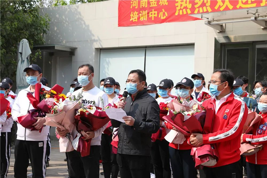 上午10时,在集中医学观察点——河南金城培训中心,河南省卫生健康委员会为援鄂医疗队举行了欢迎仪式。河南省卫生健康委员会党组成员、副主任谢李广,医政医管处处长李红星,郑州大学五附院党委书记王新军、副院长王兵和相关职能科室负责人参加。欢迎仪式由李红星处长主持。