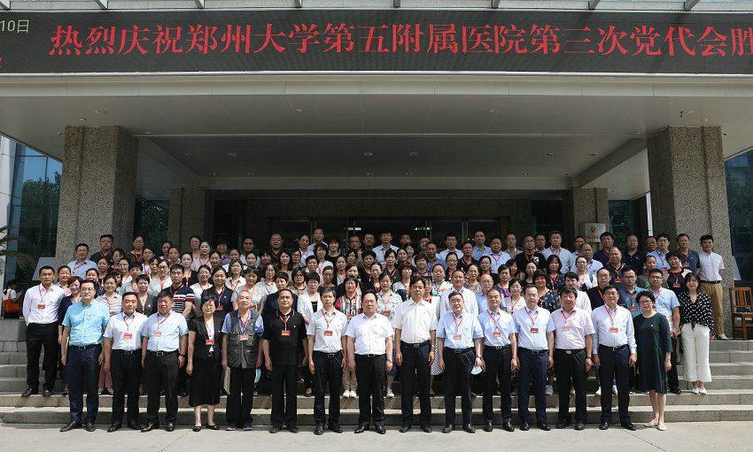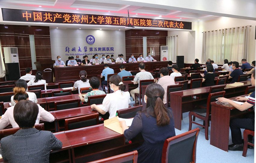 2020年6月10日,中国共产党郑州大学五附院第三次代表大会在门诊五楼会议室胜利召开。郑州大学党委副书记、工会主席,医学院党工委书记谷振清,医学院党工委副书记、纪工委书记张振卿出席大会,全体院领导班子成员及党员代表共计118人参加会议。医院老领导、各民主党派、无党派人士、离退休职工代表等应邀列席会议。
