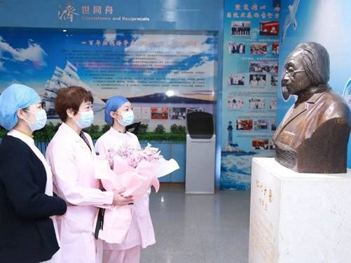 2021年4月1日上午7:50,全体参会人员满怀敬意在院史馆内集合,整齐列队、肃穆而立。团委副书记杨凡向全体参加人员讲述了医院106年的光辉历程,介绍了医院涌现出的一代又一代的德技双馨的医学专家,使新入职人员亲身感受到医院厚重的历史文化,深切体会医院医学前辈的崇高大医精神。随后向胡佩兰主任铜像前献上鲜花,全体人员向铜像鞠躬默哀。