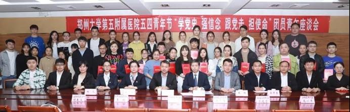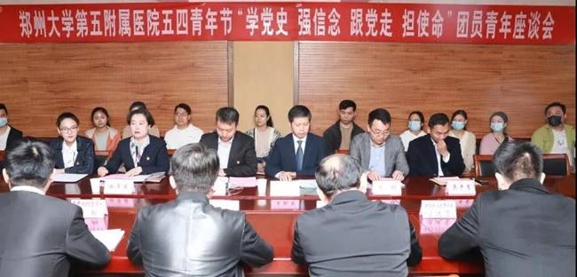 为庆祝建党100周年,深入开展党史学习教育,引导团员青年继承和弘扬五四精神,2021年4月28日下午,在“五四”青年节即将到来之际,郑州大学五附院团委召开“学党史强信念 跟党走 担使命”青年座谈会。郑州大学团委副书记(主持工作)王景涛莅临郑大五附院调研指导共青团工作,并和青年代表进行亲切交流座谈。党委书记王新军,党委副书记、工会主席徐翠英出席会议,党委办公室主任吴彦勇、郑州大学五附院援鄂医疗队临时党支部书记兼队长冯永海、团委副书记杨凡及各团支部书记、团支委、团员青年代表参加座谈。会议由徐翠英副书记主持。