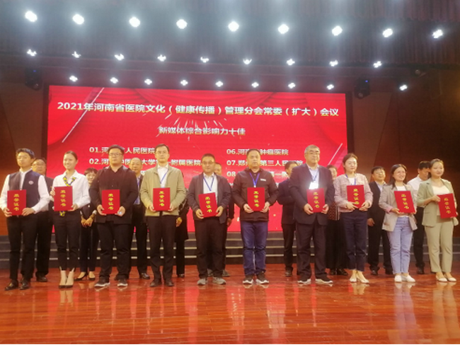 2021年4月29日-30日,河南省医院协会医院文化管理分会2021年常委(扩大)会议在焦作市召开,分会委员、各成员单位党办、宣传等部门负责人员等200余人齐聚一堂,共襄盛会。会议宣布了《关于表彰2020年度文化建设优秀论文、优秀健康传播短视频及年度“十佳”的决定》,郑州大学五附院荣获“新媒体综合影响力十佳”等多项集体和个人荣誉。河南省医院协会文化管理分会副主任委员、郑州大学五附院党委书记王新军出席会议并颁奖,宣传科科长马珂代表医院领取获奖证书。