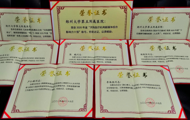 此次荣获诸多奖项既是省医院协会医院文化管理分会、省健康传播工作委员会对医院工作的肯定,更是对医院下一步提升文化建设和健康传播工作水平的鞭策和鼓励。今后,郑州大学五附院将继续围绕医疗卫生行业“敬佑生命、救死扶伤、甘于奉献、大爱无疆”的崇高精神,结合新冠疫情防控需要,通过持续加强自媒体平台建设,挖掘先进典型精神内涵,打造医疗服务品牌,开展健康科普传播活动、传播健康文化,创作出更多贴近医院工作实际和人民健康需求的科普作品。通过不断加强医院文化理论研究和转化,传承和发扬医院106年厚重历史所积淀的宝贵精神财富,讲好五附院故事,传播五附院声音,持续促进医院党建、医疗、护理、教学、科研、管理、服务等各项工作高质量开展,为党的百年华诞献上一份满意的答卷!