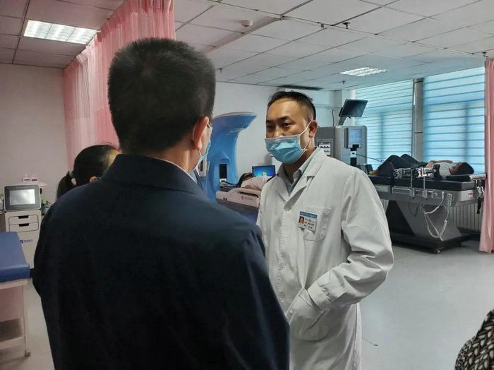 在社区医养结合中心康复治疗室、老年医学科病房、医养结合病房以及社区公共卫生、计划免疫区域,苏俊生董事长边参观边交流。他表示,福华街社区卫生服务中心的智慧医养结合探索实践对推动我省医养结合发展、体系、产业链发展具有重要意义,并且具有很强借鉴经验。