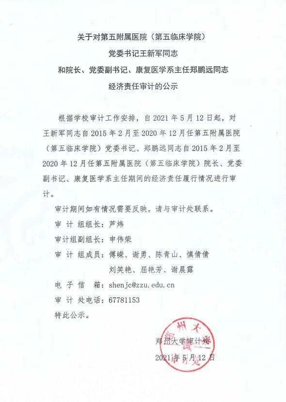 关于对第五附属医院(第五临床学院)党委书记王新军同志和院长、党委副书记、康复医学系主任郑鹏远同志经济责任审计的公示