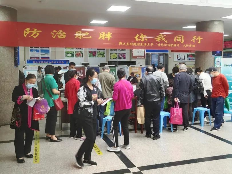 2021年5月11日上午,郑州大学五附院临床营养科、内分泌科在医院门诊部一楼大厅联合举办了“防治肥胖,你我同行”——世界防治肥胖日义诊活动。由中国营养保健食品协会发起、体重管理专委会承办的“5.11防治肥胖公益活动”同时启动。