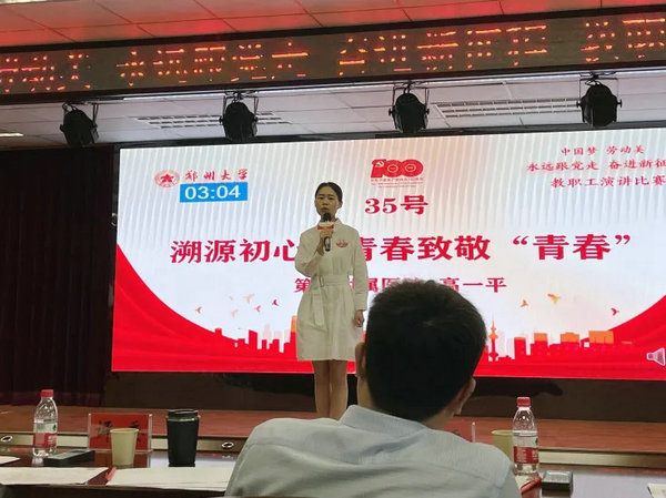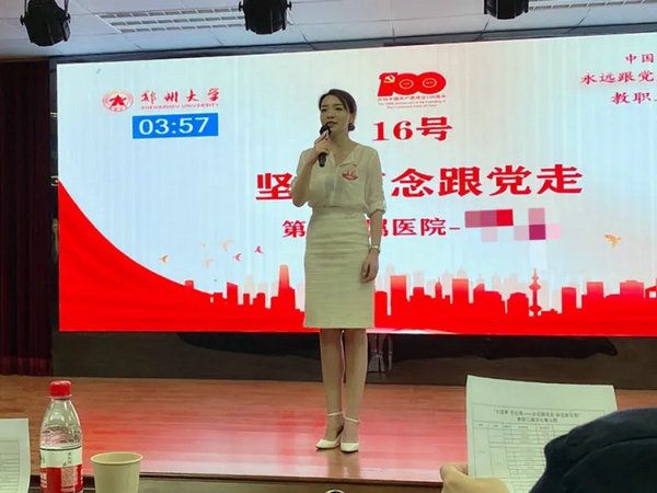 为庆祝中国共产党建党100周年,学习贯彻习近平总书记在党史学习教育动员大会重要讲话精神,2021年5月14日上午,由郑州大学工会主办、教育学院承办的“中国梦·劳动美——永远跟党走 奋进新征程”教职工演讲比赛在郑州大学行政楼第二报告厅举行,郑州大学党委书记宋争辉,党委副书记、工会主席谷振清等校领导出席本次比赛。郑州大学五附院参赛选手急诊科苑晓茜荣获二等奖,消化内科一病区高一平、消化内科三病区葛久煜荣获优秀奖。