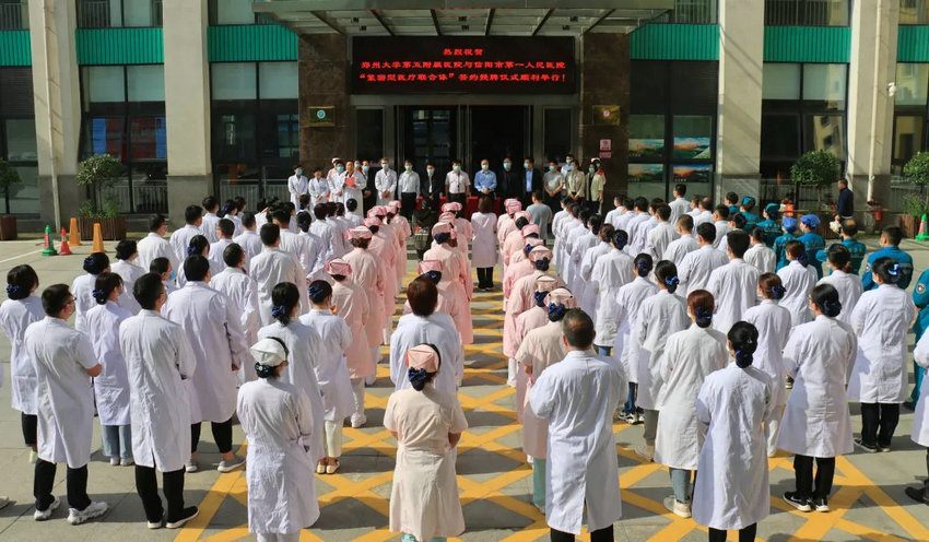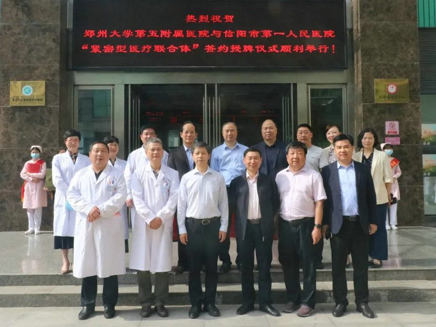 2021年5月18日,信阳市第一人民医院加入郑州大学五附院“紧密型医疗联合体”签约揭牌仪式暨义诊、查房、等技术交流活动在该院举行。郑州大学五附院党委书记王新军、副院长朱光,信阳市卫健委党组成员、副主任黄楚安,信阳市第一人民医院党委书记肖明星,党委副书记、纪委书记郑怀华出席签约暨授牌仪式。郑州大学五附院神经外科、血管外科、胃肠甲状腺外科、脊柱骨病科等科室专家参加签约授牌仪式。仪式由信阳市第一人民医院党委副书记、纪委书记郑怀华主持。