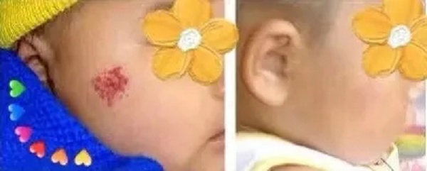 ▲ 婴幼儿皮肤血管瘤治疗前(左)、治疗后(右)对比图