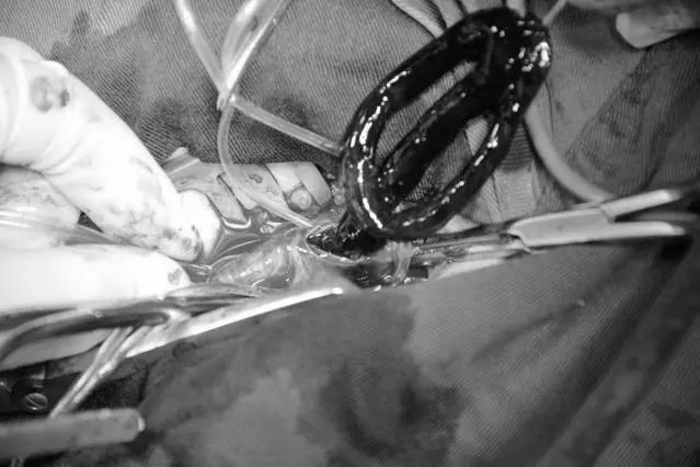 ▲ 图2 术中经股动脉切口取出大量血栓