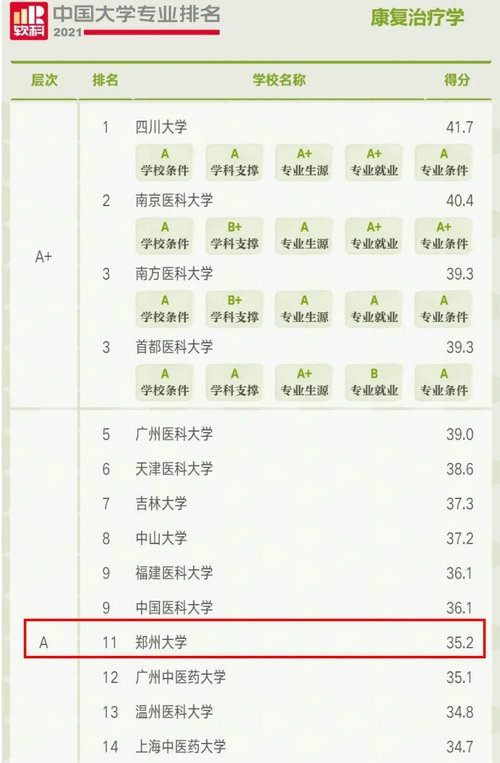 2021年6月22日,高等教育评价专业机构软科正式发布2021“软科中国大学专业排名”,郑州大学康复治疗学专业位于“A”层次,全国排名第11位。此次软科排名包括509个本科专业, 925所高校的28550个专业上榜,康复治疗学专业共有88所高校上榜,其中四川大学、南京医科大学、南方医科大学与首都医科大学位居前三名。