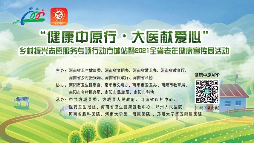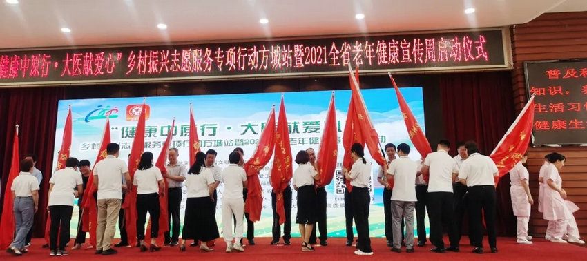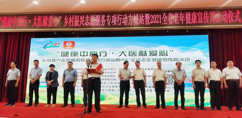 启动仪式由省卫生健康委宣传处处长杨力勇主持。在启动仪式上,省卫生健康委党组成员、副主任,省老龄办常务副主任王成增出席启动仪式并讲话。省卫生健康委老龄健康处处长王自立,省乡村振兴局行业帮扶处处长范胜利,省民政厅慈善事业促进和社会工作处副处长丁兴魁,省科协科普部副部长邓西森,南阳市卫生健康委副主任郭晓华,方城县人民政府县长李霞,郑州大学五附院党委书记王新军、副院长傅聿铭领导等参加仪式并向河南省科普专家授旗。