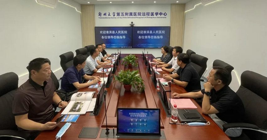2021年7月15日下午,淮滨县人民民医院院长杜云华一行来郑州大学五附院参观交流。党委书记王新军、副院长朱光热情接待来宾,信息与远程医疗科、医疗协作办公室等科室负责人参加座谈会。