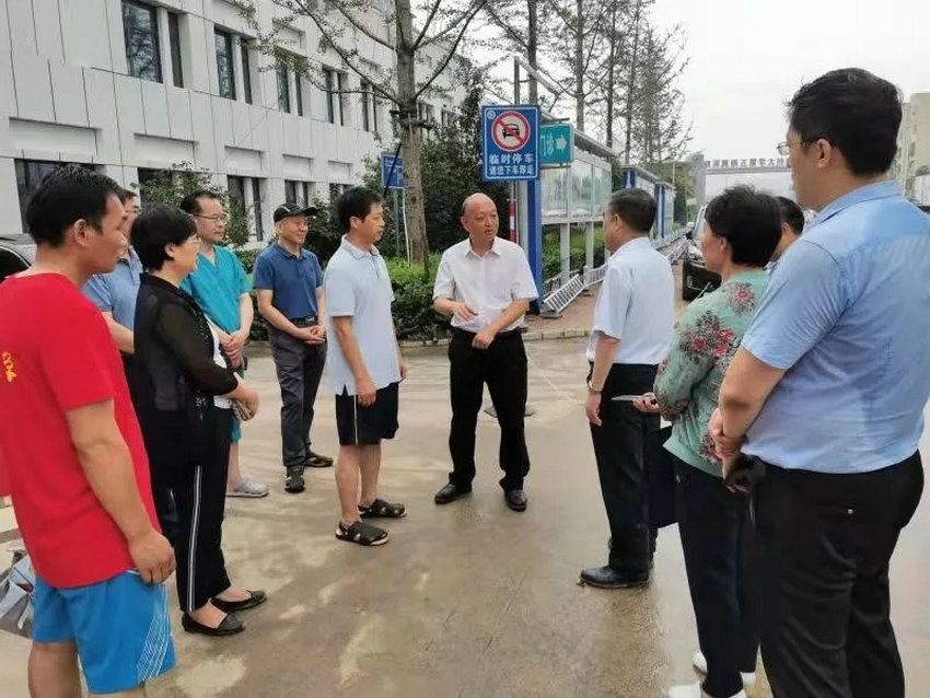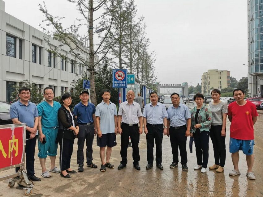 在门诊楼大厅前,郑州大学副校长、医学院院长董子钢带领医学院党工委副书记、本科生党委书记张洁,医学院副院长、教学办公室主任俞海洋,医学院机关党总支书记、综合办公室主任任义,医学院医院管理办公室主任李静,医学科学院副院长、研究生办公室主任郑红,医学院临床技能中心主任张景华一行实地查看了院区受损情况,认真听取了王新军书记、郑鹏远院长关于医院患者救治、物资储备、水电供应和防汛救灾情况的工作汇报,对医院防汛救灾工作成效给予肯定,对医院广大党员干部、教职员工、实习学生表示慰问。他强调,在接下来的工作中医院要尽快恢复正常诊疗秩序和教学秩序,保证水电和物资供应,想尽办法为患者和家属排忧解难,并安排好医院人员的值班和休息,严防传染病等次生灾害的发生。郑州大学医学院是附属医院的坚强后盾,将为医院防汛抗灾和重建工作提供必要的帮助,大家团结一心,共渡难关。