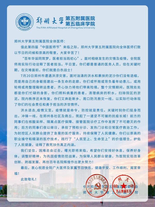 值此第四届“中国医师节”来临之际,郑州大学第五附属医院向全体医师们致以节日的问候和崇高的敬意,大家辛苦了!
