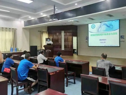 ▲ 感染管理科为第三方物业公司保洁人员、安保人员,施工项目人员进行感控知识培训,后勤管理科、保卫科会后将培训要点对全体人员一一传达、考核