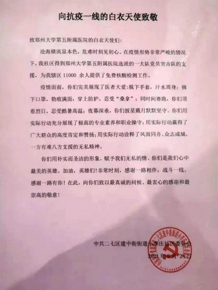 值得一提的是,在核酸检测采样工作紧张有序进行中时,突然收到“自2021年8月24日18时起,对二七区建中街街道解除封控管理”的好消息,每个人的脸上都洋溢着笑容。现场等待核酸检测的居民纷纷为队员们点赞,并说道:“正是你们的辛勤付出,加快了这座城市恢复的脚步,让我们为之感动。”