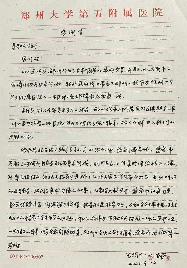 ▲ 来自核酸筛查采样队队员、消化内科一病区护士长、高一学生家长刘海霞的感谢信