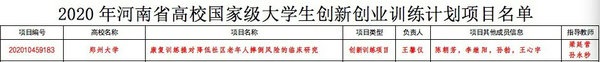 近日,河南省教育厅发布2020年度国家级和省级大学生创新创业训练计划项目结题验收评审结果。郑州大学五附院(第五临床学院)梁廷营老师带领的团队,在院领导的殷切期望和大力支持下,课题“康复训练操对降低社区老年人摔倒风险的临床研究”经过层层选拔和激烈角逐,在2021郑州大学大学生创新创业项目结题验收评审中荣获“优秀”。
