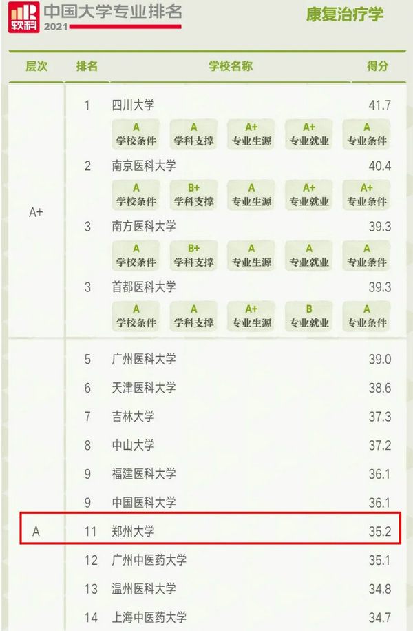 ▲ 2021中国软科康复治疗学专业排名,郑州大学康复治疗学专业排名全国第11位