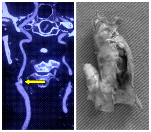 左图:右侧颈内动脉重度狭窄并钙化 右图:剥脱的颈动脉斑块