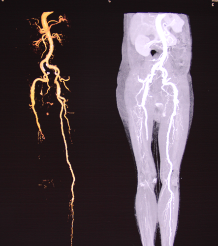 患者于夜晚20:10由当地医院救护车转送入我院。当时患者右下肢缺血严重,双侧股动脉巨大搏动性包块,肢体保全几率极低!值班医生丁语接诊病人后,意识到患者病情危重,立刻请彩超室值班医生王敏进行床旁迅速定性诊断,发现患者右下肢动脉全程血栓形成,双侧股动脉巨大动脉瘤合并血栓形成。我院血管外科专家王兵副院长得到汇报后指示立即为患者进行下肢动脉CTA检查,进一步明确诊断。CT室值班医生姜喜峰迅速给以 “绿色通道”,使患者在入院不到1小时就拿到了影像学结果。王兵副院长和血管外科崔文军副主任根据患者CTA结果,确诊该患者是一例罕见双侧股动脉巨大动脉瘤并附壁血栓并右下肢急性动脉栓塞。