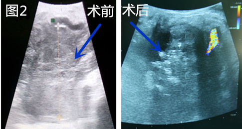 两例手术分别于2016年元月28及29日进行,超声科杨青主任术中超声定位,麻醉科胡强夫主任带领的团队实施麻醉、稳定血压及心率为手术保驾护航,该手术由李晓勇教授亲自主刀,联合崔卫东副主任医师、张永及陈升阳医师,术中精确定位,精准布针穿刺,精准控制消融范围,两例手术均成功完成。术后彩超提示肿瘤完全消融,局部呈气化改变(图2)。术前的充分评估,术中精细化的操作,加之术后的精心管理及护理,让患者顺利恢复,有效避免了胰瘘、胆瘘、大出血等并发症的发生。