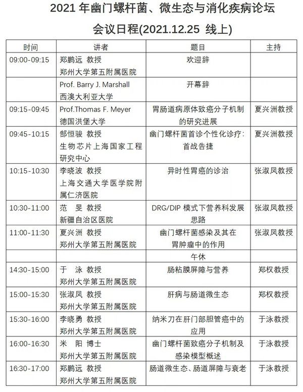 为推进消化系统领域的学术交流,造福于河南省消化系统疾病和相关疾病患者,助力健康中国,由郑州大学第五附属医院举办的国家级医学教育项目“2021年幽门螺杆菌、微生态与消化疾病论坛”【项目编号:2021-03-03-357(国)】将于2021年12月24-25日在河南郑州召开,现诚挚邀请全国及省内消化专业的同道参加。幽门螺杆菌、微生态与消化疾病论坛自2017年来已成功举办四届,已成为省内幽门螺杆菌及微生态专业领域的精品论坛,深受消化专科医生的认可和欢迎,是极具专业影响力的学术交流平台。