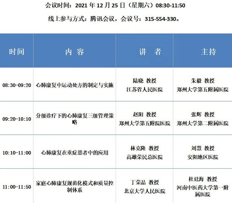 国家级继续医学教育项目:2021心肺康复三级流程管理和策略培训班(项目编号:2021-03-01-093 (国))由郑州大学第五附属医院主办,论坛将于2021年12月24日-26日在郑州举办,本次培训班贯物“健康中国2030”战略,提升心肺功能,改善患者生存质量,时将邀请国内著名专家学者线上授课,参加论坛者将授予国家级继续教育1类学分5分,免收注册费。本次论坛将采取腾讯会议线上形式举行,诚邀您线上参加本次论坛。