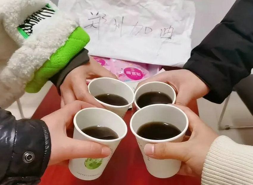 在二七区庆丰街社区核酸采样点,由于一天的高强度工作下来,队员们早已是浑身冻透。看到这种情况,核酸采集17组组长、体检科护士长刘楠每天从自己家中用保温杯带来可乐姜茶,为队员们驱寒暖胃,更暖了队员们的心。