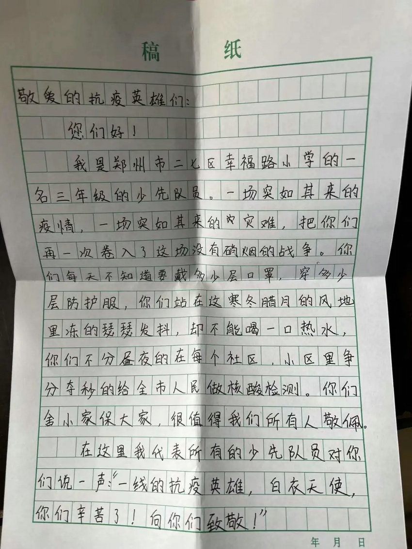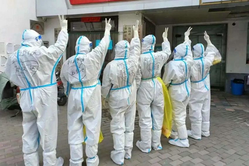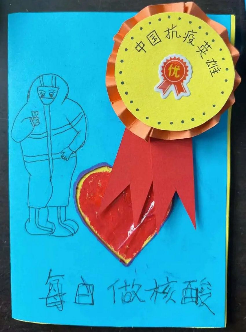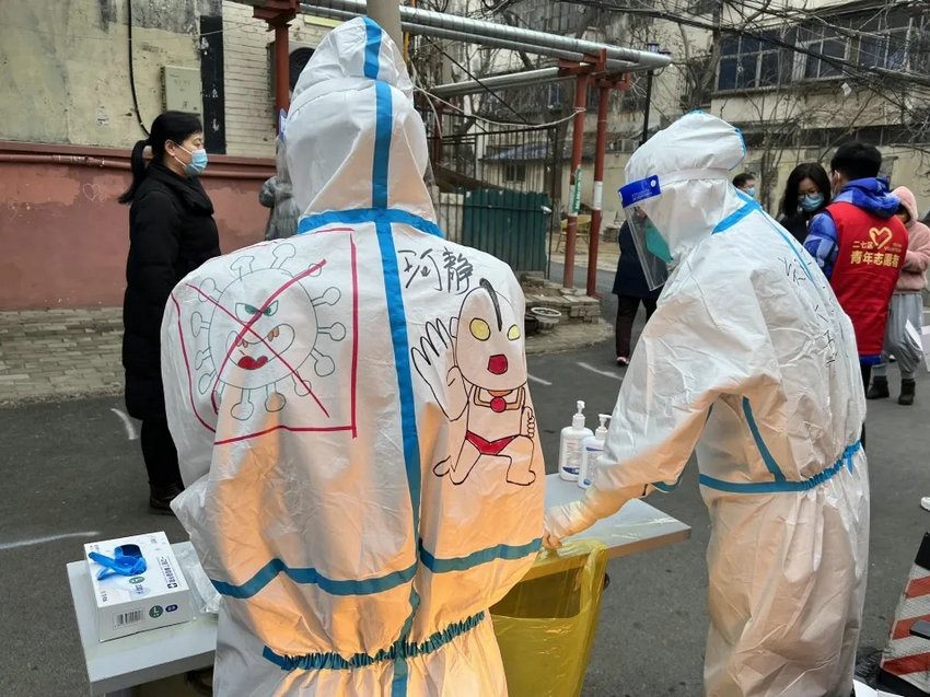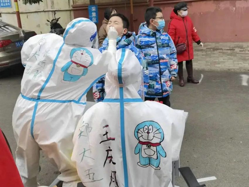 因为疫情,很多学生都在家上网课,为了缓解小朋友做核酸时的紧张情绪,工作在二七区建中街街道西福民社区核酸采样点的郑州大学五附院队员们自发绘制了 “卡通防护服”,有越战越勇、专打怪兽的奥特曼,有哆啦A梦……一幅幅承载着爱心和想象力的画,犹如一缕清风,冲淡了疫情带给孩子们的心理压力。