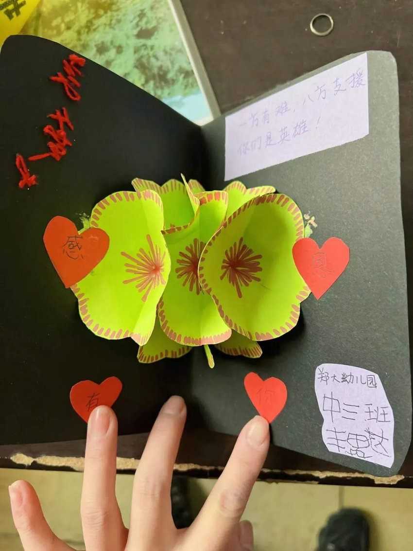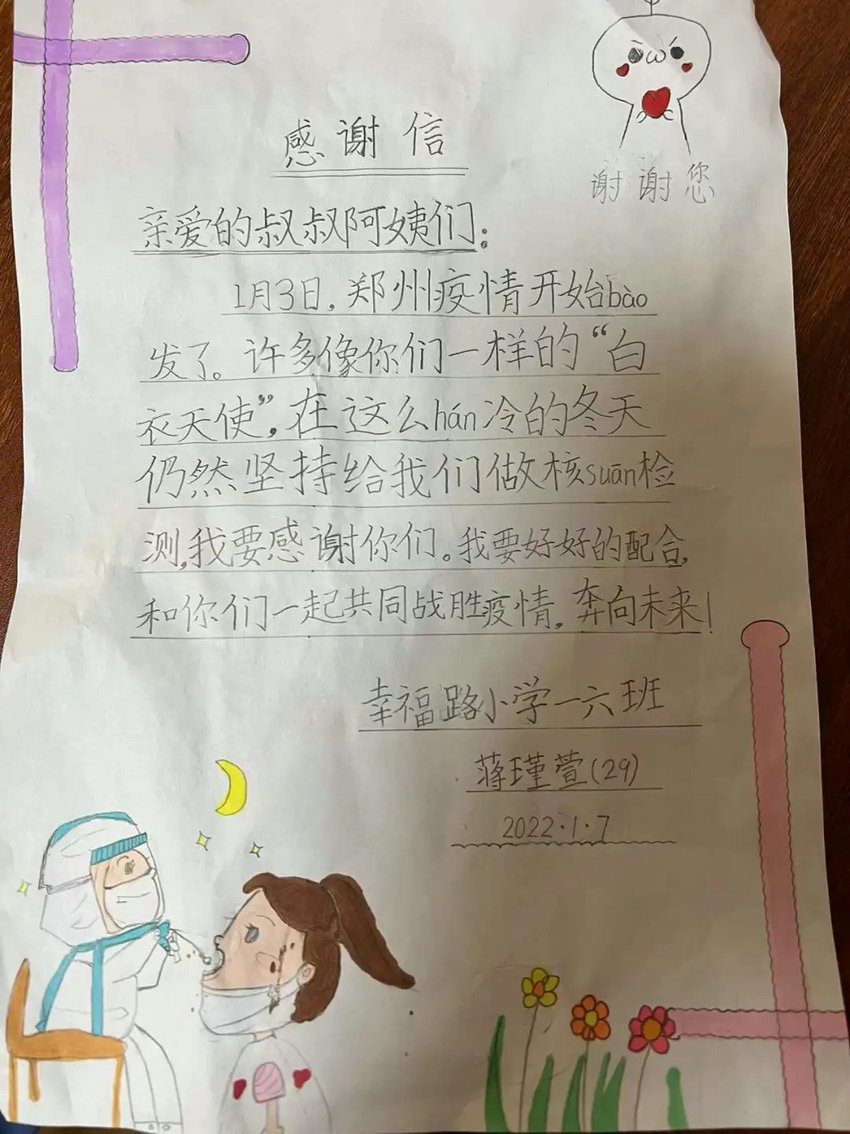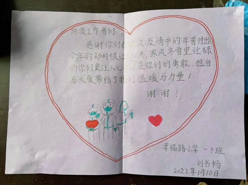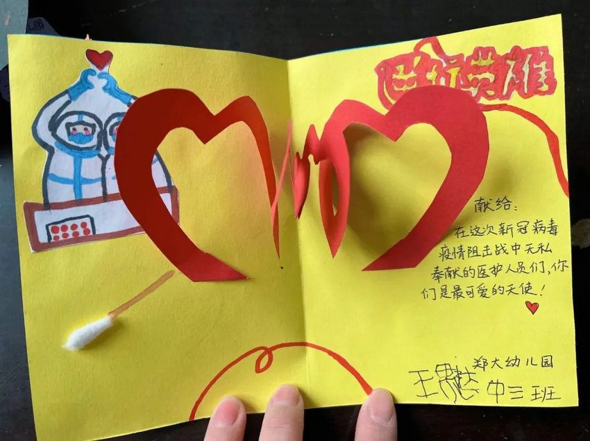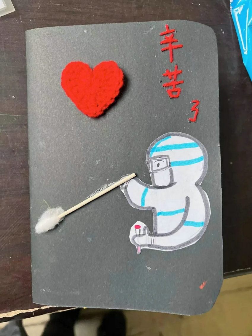在核酸检测过程中,接受采样的小朋友让郑州大学五附院队员们一次又一次倍受感动,他们有的送来了又大又圆的红苹果、有的送来了自己手工制作的花束和“大白”手办、有的送来了感谢信、有的送来了祝福贺卡......在这个凛冽的寒冬,虽然队员们十分辛苦,这些来自小朋友们的特殊礼物,都将永恒地留在了每位队员的回忆中。
