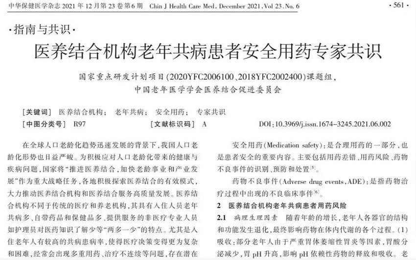 近日,由郑州大学第五附属医院郑鹏远教授、中国人民解放军总医院杨长春教授、杨庭树教授联合牵头制定的《医养结合机构老年共病患者安全用药专家共识》发表于《中华保健医学杂志》。该共识为我国首部关于医养结合机构老年共病患者专业性用药共识,填补了该领域的国内空白。
