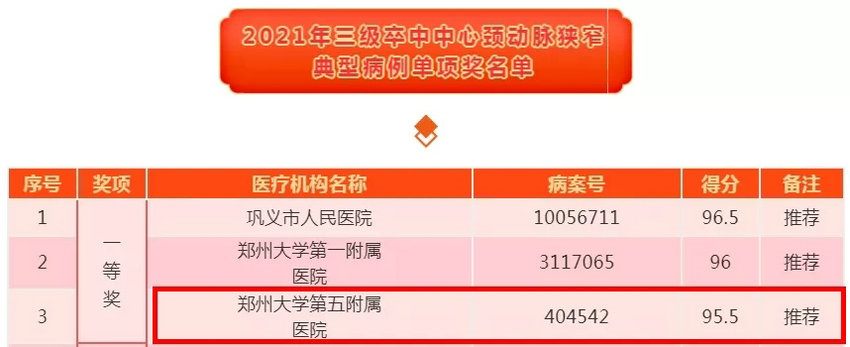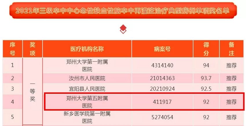 近日,河南省卫生健康委开展了 2021 年度胸痛、卒中、创伤中心优秀典型案例评比活动,目的是总结各地经验,为全省胸痛、卒中、创伤中心医疗救治提供典型经验,进一步提升全省急危重症救治水平。郑州大学五附院脑卒中管理办公室积极号召各卒中相关科室报送适宜技术病案参选,经过多层公平公正的筛选审核后,医院参选的单纯静脉溶栓技术病案(主管医师神经内科一病区田小瑞)获得“2021年三级卒中中心急性缺血性脑卒中再灌注治疗典型病例单项奖一等奖”,颈动脉支架植入术技术病案(主管医师介入科刘凯)获得“2021年三级卒中中心颈动脉狭窄典型病例单项奖一等奖”。