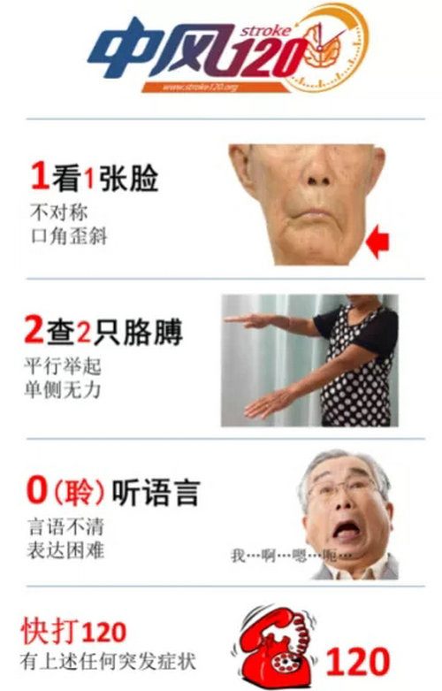 中风120法:1(1张脸,歪啦)、2(2条胳膊、有胳膊抬不起来啦)、0(聆听语言,说不清楚啦),快快拨打120!
