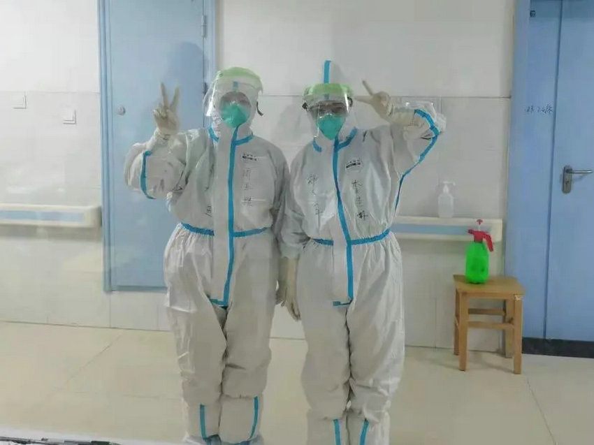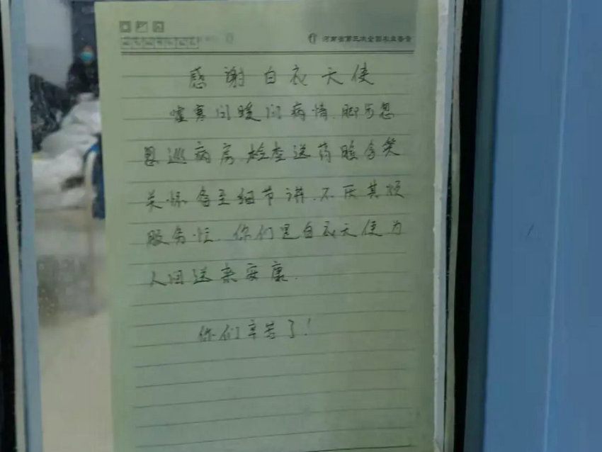 一天,队员冷冰主管护师正在值班做消杀工作,有一位20多岁的患者隔着病房玻璃窗写下了:“感谢白衣天使,嘘寒问暖问病情。脚步轻轻巡病房,检查送药脸含笑,关怀备至细节讲,不厌其烦的服务,你们是白衣天使为人间送来安康,你们辛苦了!”当冷冰看到这封表扬信时,泪水湿润了她的眼眶。因为她深知,这是患者对医疗队队员们辛勤工作的肯定和褒奖。冷冰也暗下决心,要用自己所学的知识服务好患者,让他们早日康复和家人团聚。