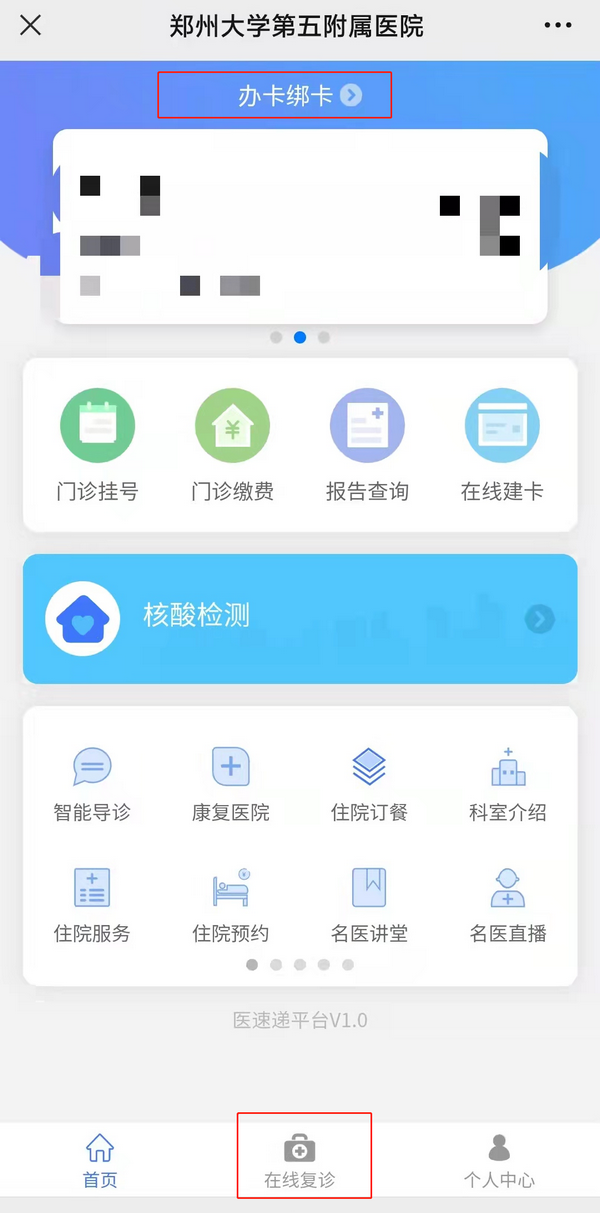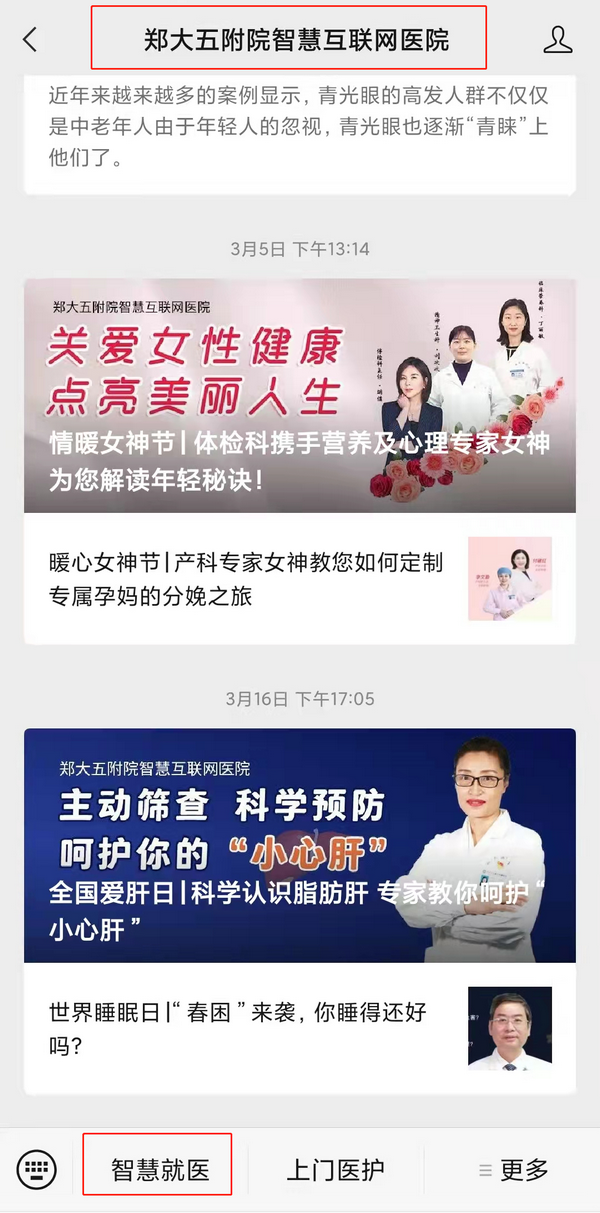 线上专科门诊目前均为免费咨询,不受时间、场所限制,可有效节约患者就诊时间,避免交叉感染,减少时间及经济成本,让患者在轻松愉快的环境下进行咨询。咨询路径如下:扫码或者微信搜索“郑大五附院智慧互联网医院”→点击左下角“智慧就医”(首次关注需要办理线上办卡,实名注册)→选择下栏中间“在线复诊”→选中要咨询的科室及对应的医护人员→添加真实患者信息进行咨询(如咨询者为办卡本人直接选中即可)。