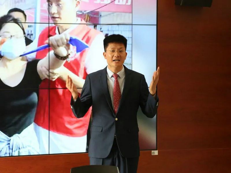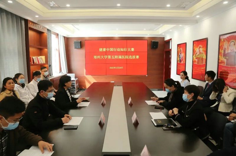 为深入贯彻健康中国行动,进一步加大健康知识普及力度,激发医务工作者开展科普宣传的积极性和主动性,2022年3月29日,郑州大学五附院在行政楼四楼会议室成功举办“健康中国行动知行大赛”医院选拔赛。院党委副书记、工会主席徐翠英出席,院长助理、医务科科长王琰,护理部主任韩晓霞,机关党总支第一党支部书记王凯,宣传科科长马珂担任评委,各党总支书记现场观摩本次比赛。