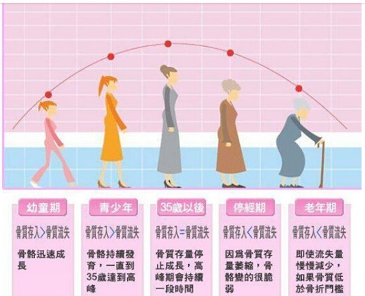 骨质疏松是随着年龄增长而进行性开展的疾病,其特点为骨密度减低和骨软弱性添加,骨质流失的过程是不可逆的,因此我们需要了解不同年龄阶段骨质存入和骨质流失的情况。