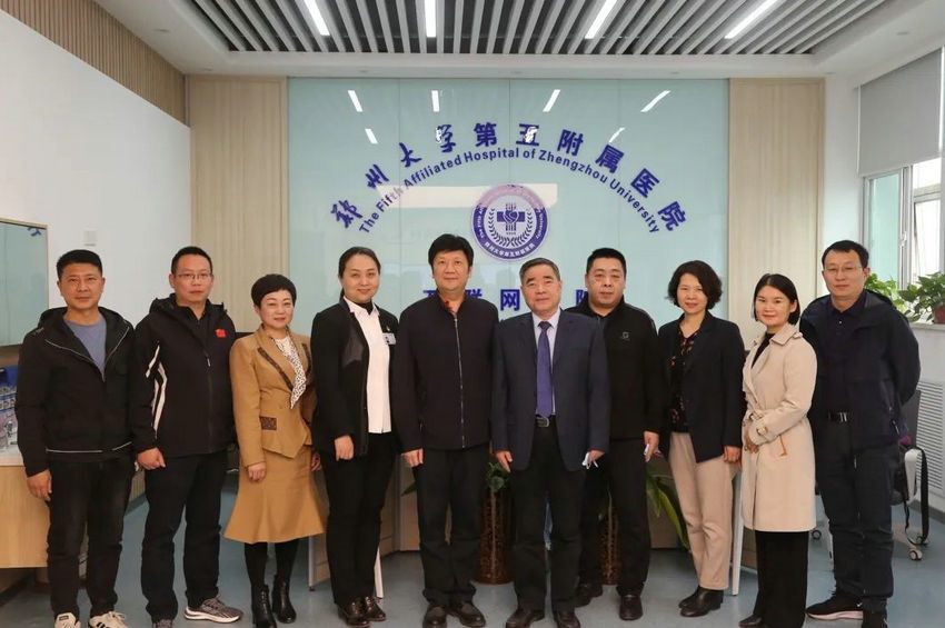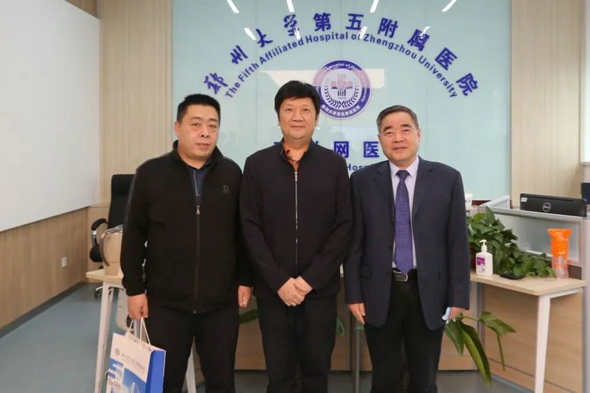 2022年4月15日,2004年奥运会冠军、河南省社会体育事务中心主任贾占波,副主任李罡、中心办公室主任闫书鹏、三部部长刘刚,河南阿美亚文化传媒有限公司董事长张利鹏一行5人到访郑州大学第五附属医院(原郑州铁路局中心医院,始建于1915年),就体医融合、医养结合、智慧医养、科学建身“云课堂”开展沟通与交流。郑州大学五附院院长郑鹏远教授热情接待来宾,相关职能部门负责人参加座谈交流,会议在门诊五楼远程医学中心进行。
