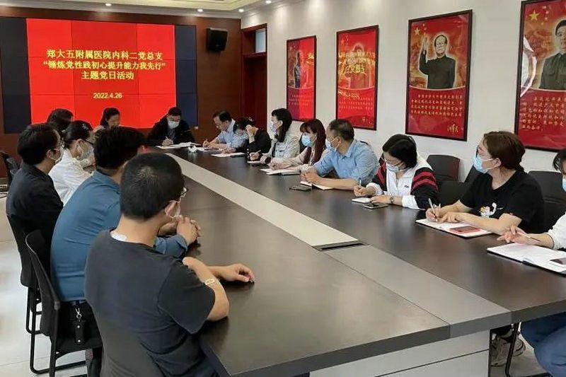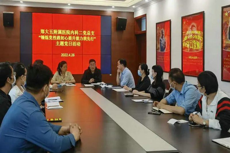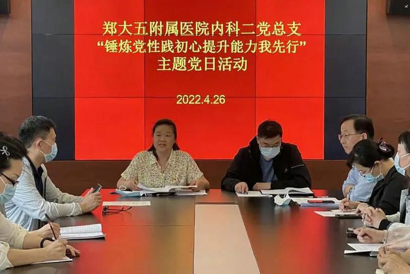 2022年4月26日下午,郑州大学五附院内科二党总支开展“锤炼党性践初心,提升能力我先行”主题党日活动。郑州大学五附院副院长、郑州大学康复医院院长汤有才以普通党员的身份参加本次主题党日活动。活动由内科二党总支书记宋玉侠主持。
