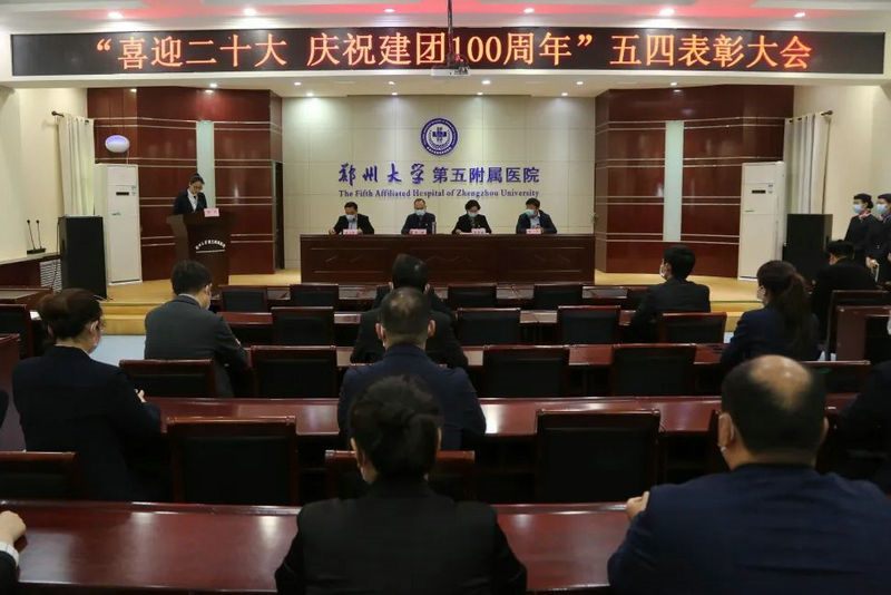 百年正青春,奋进新征程。2022年4月28日下午,在“五四”青年节到来之际,郑州大学五附院在门诊楼五楼会议室召开“喜迎二十大 庆祝建团100周年”五四表彰大会。党委书记韩晔,党委副书记、工会主席徐翠英,纪委书记周文平,副院长朱光出席会议,党委办公室主任吴彦勇,部分党总支书记、党支部书记,各团支部书记、部分获奖青年代表以及2022年发展对象培训班的全体学员参加会议,会议由团委副书记杨凡主持。
