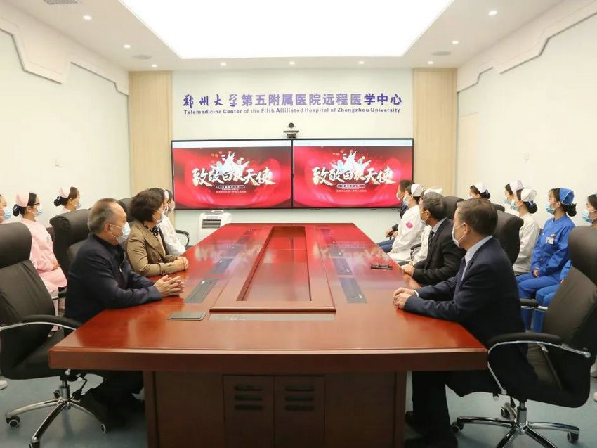 2022年5月12日上午,郑州大学五附院党委书记韩晔,院长郑鹏远,党委副书记、工会主席徐翠英,副院长王少亭与护理部主任韩晓霞、副主任李艳华及医院优秀护士代表一起在门诊楼五楼远程会诊中心收听收看了河南省卫生健康委员会党组书记、主任阚全程对全省护士的慰问讲话。