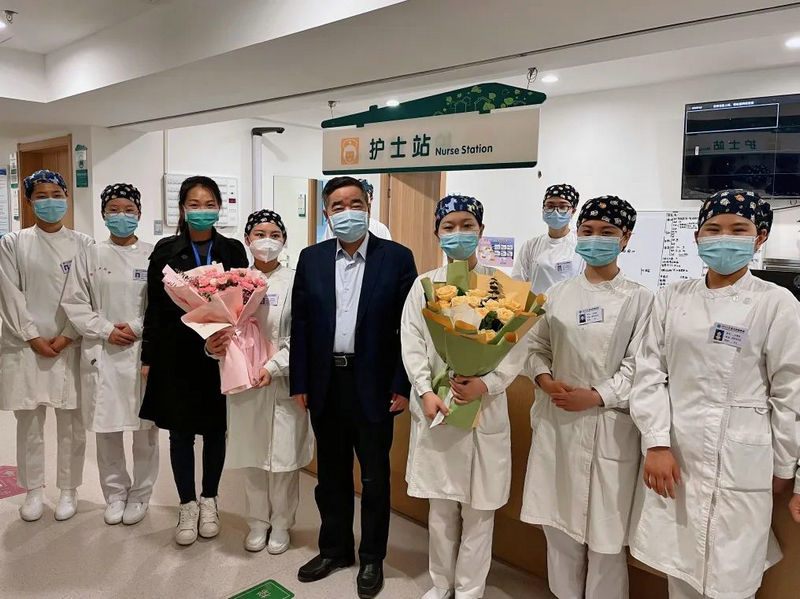 2022年5月12日,院长郑鹏远到福华街社区卫生服务中心看望慰问工作在一线的护理人员,送上节日祝福,并与护士亲切交谈,嘱咐大家疫情期间做好防护,注意休息,愉快工作!