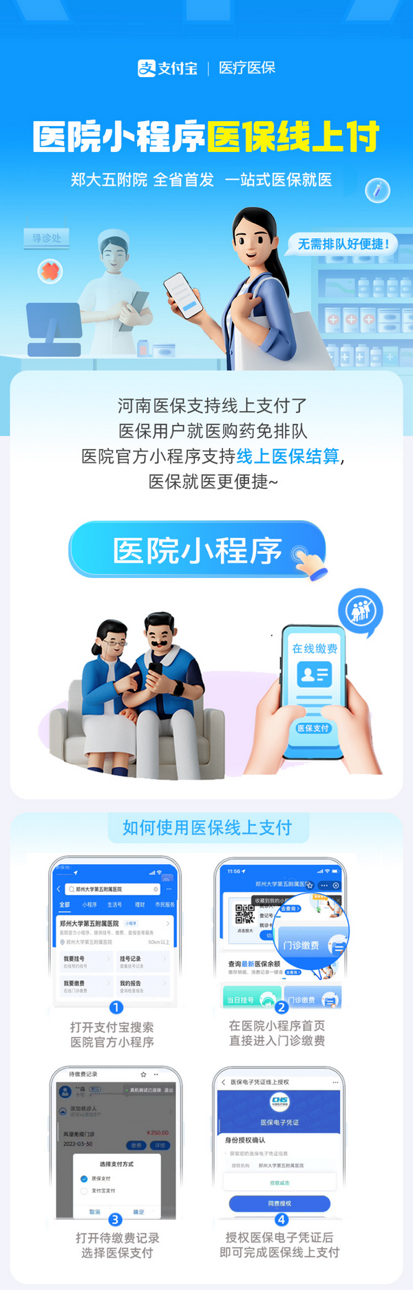 此前,市职工参保人员必须持实体医保卡或医保电子凭证,到医院收费窗口才能刷医保购药、检查缴费。如今,门诊就医后待缴费的患者,无需再去收费窗口排队,仅凭一部手机,在支付宝小程序搜索“郑州大学第五附属医院”点击门诊缴费,支付时选择医保支付,系统就会自动跳转到医保电子凭证授权页面,按照提示点击一键支付,线上医保结算即可完成。