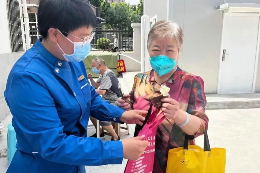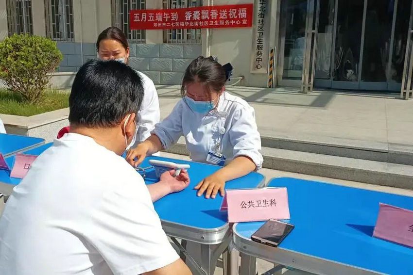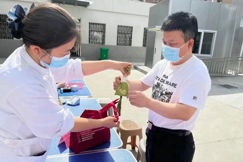福华北街社区卫生服务中心工作人员给参与义诊的居民送上自制香囊,清幽的香气弥漫开来,既增添了节日的气氛,又有驱虫辟邪的功效。